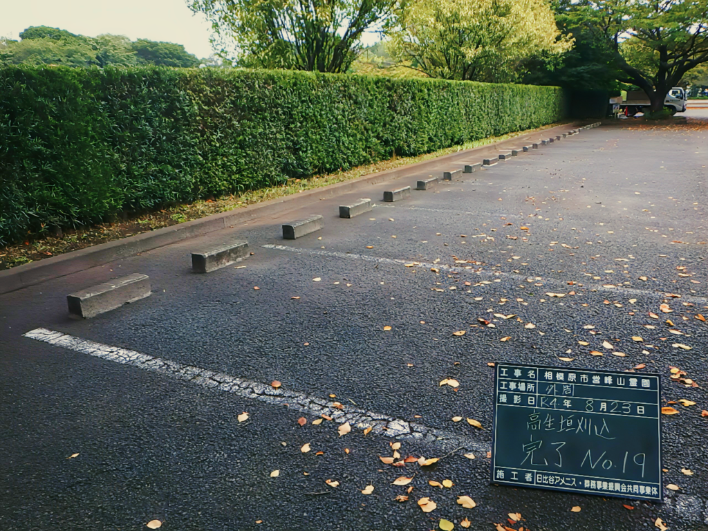 造園業として、こうした公園型墓地の低木や生垣を整える作業には、供養の場を守る専門職としての「おもてなし」と「空間演出」の意義が深く込められています。